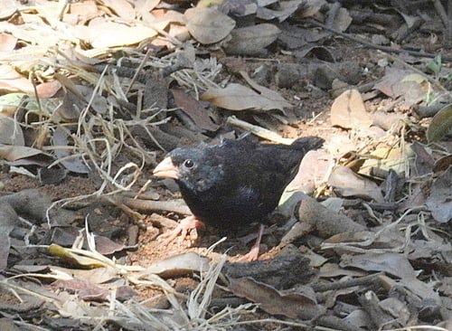 My daughter and I spotted some village indigobirds rifling through leaf litter beneath some musasa trees.